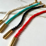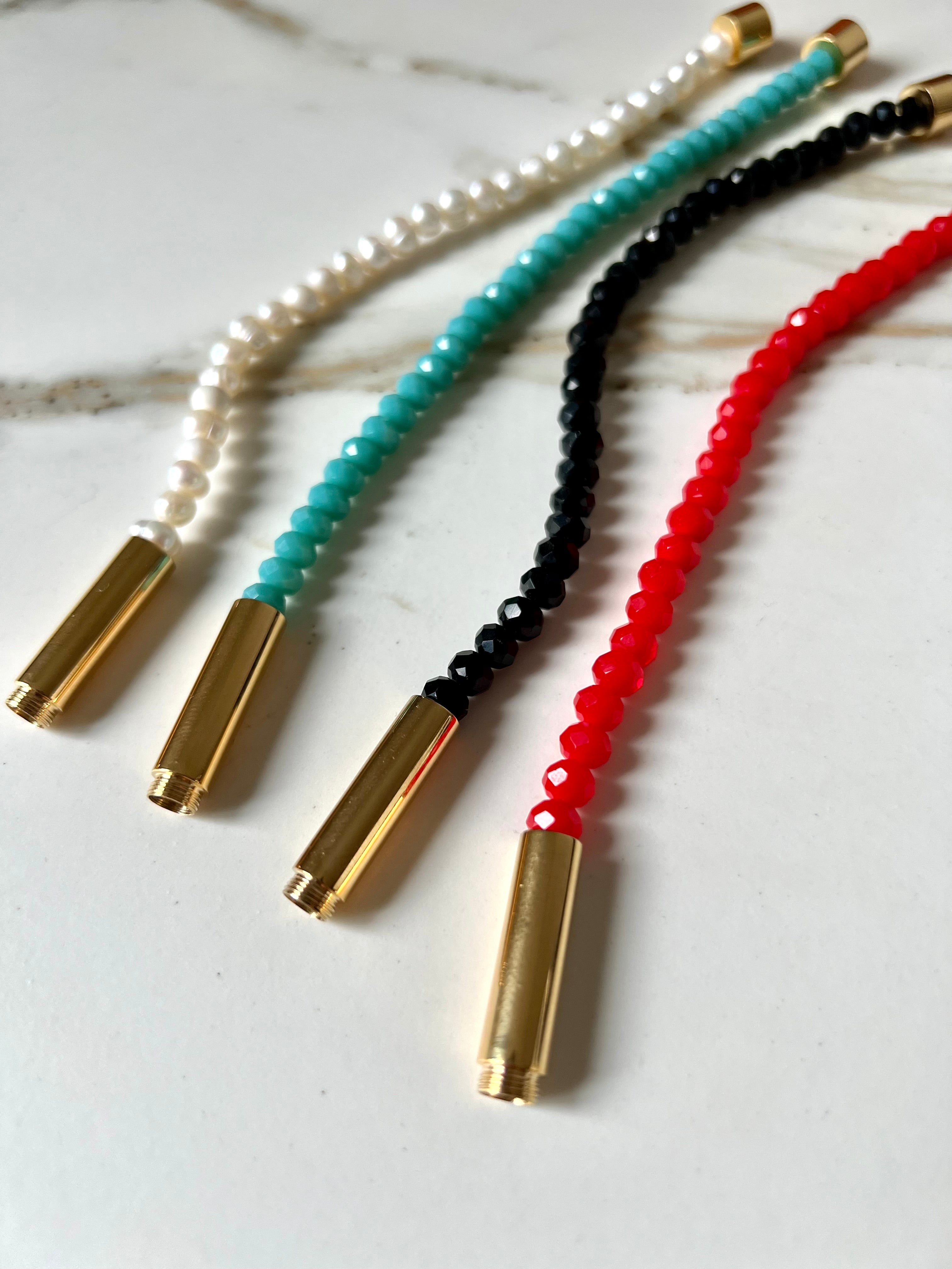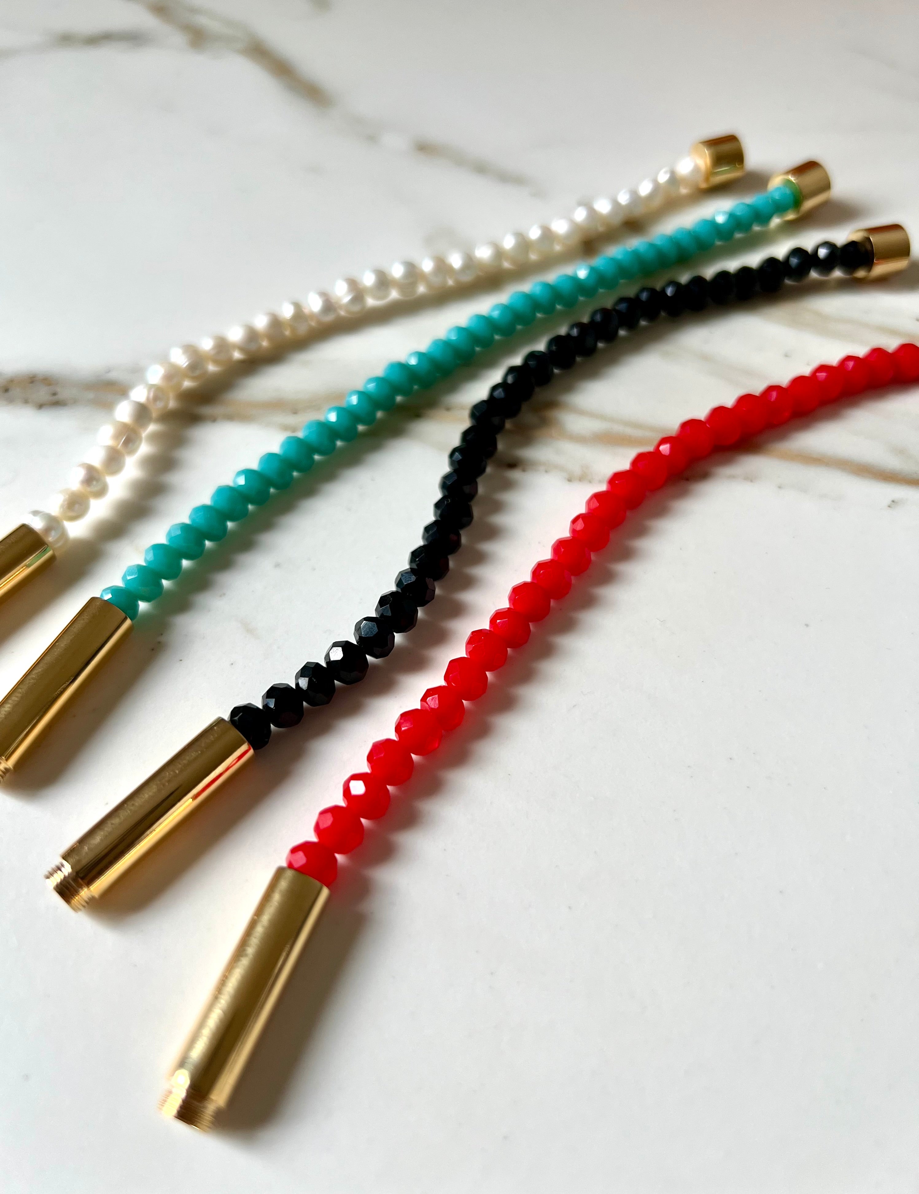 - In zwart, turquoise, rood en parel.