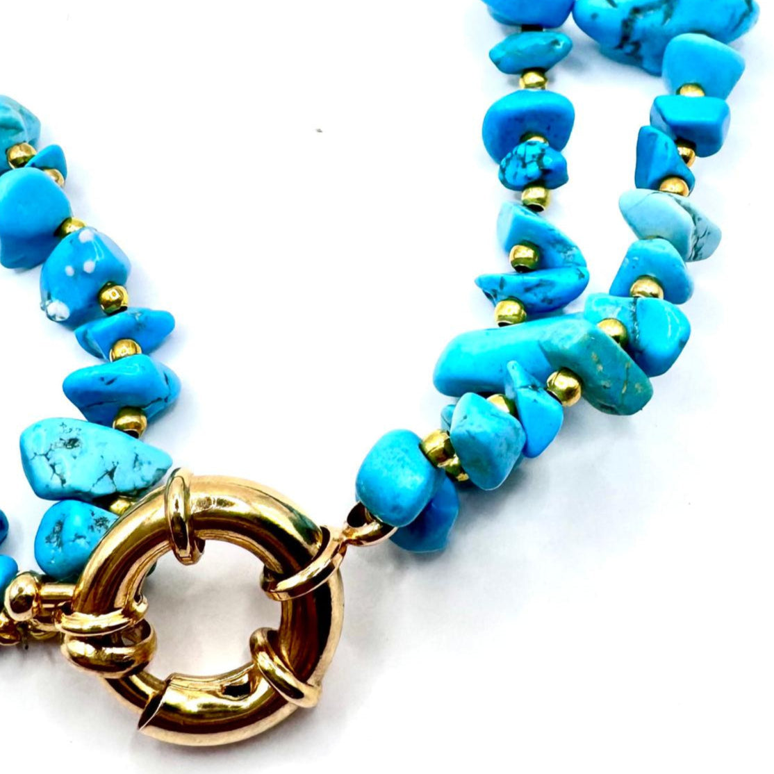 Deze armband, gemaakt van prachtige turquoise chips kralen, straalt pure elegantie en kracht uit. De levendige turquoise tinten worden versterkt door verfijnde 3 micron gouden details, wat zorgt voor een luxueuze en verfijnde afwerking. Maak je outfit compleet met de bijpassende Turquoise Chips Necklace