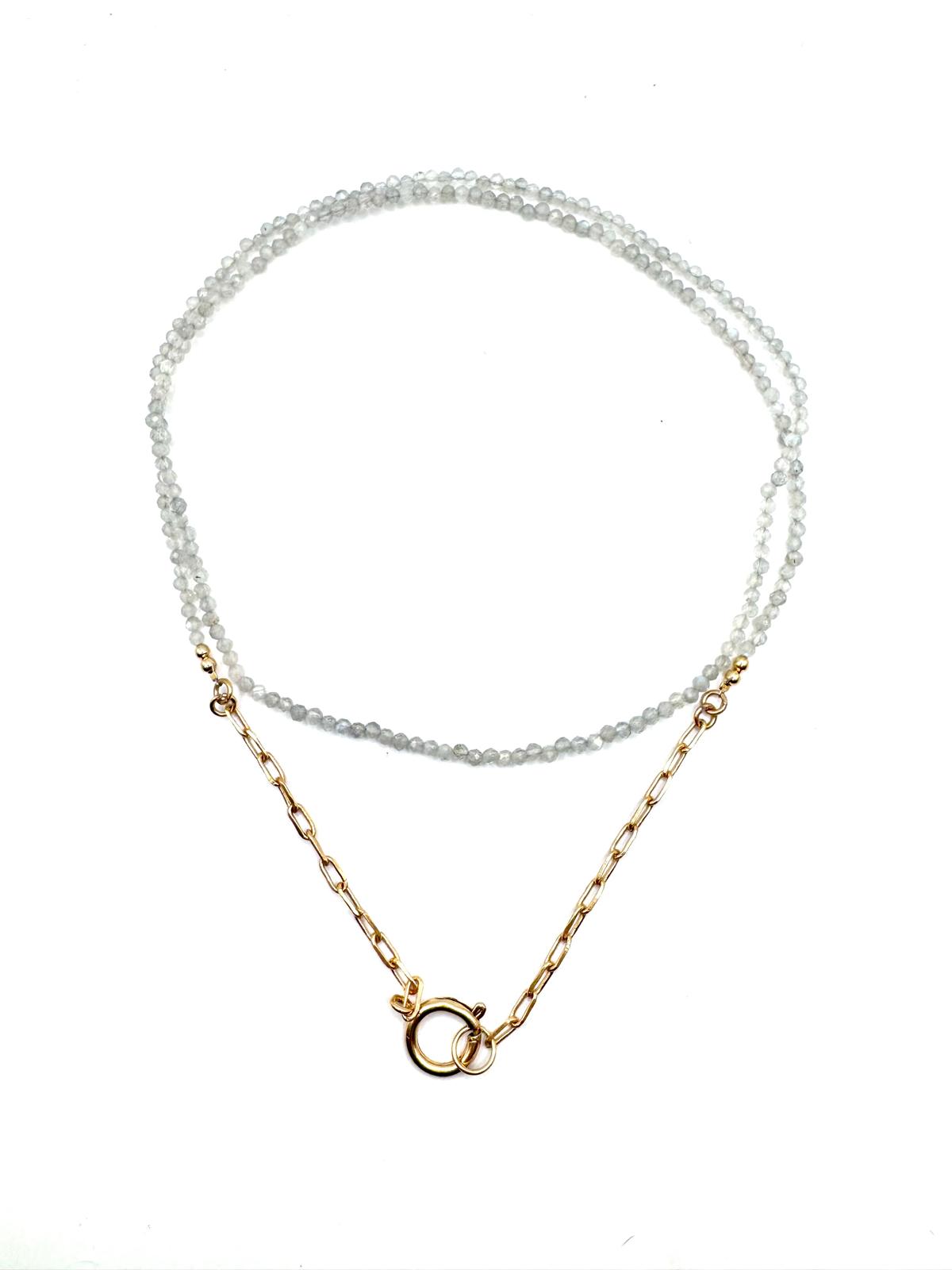 Elke gardarobe heeft een mooie natuurstenen kralenketting nodig, en deze heeft nét even iets meer dan dat. De Daya Necklace is gemaakt van 65 cm natuursteen en 15 cm paperclip ketting. Door de lock aan deze ketting kun je hem nog eigen maken, door er één (of meer) van onze leuke bedels aan te hangen. Less is bore, more is more!