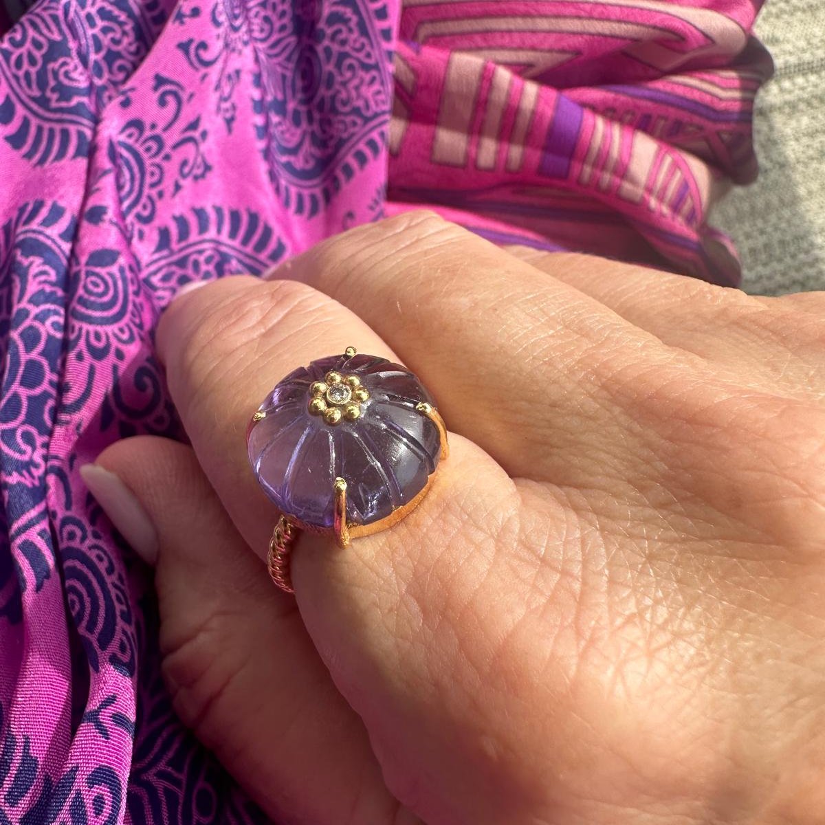 De Flower Ring lijkt op een snoepje en is dan ook letterlijk jewelry candy te noemen. De ring is verstelbaar naar elke maat en verkrijgbaar in zes verschillende edelstenen: Amethyst, Green Onyx Amazonite, Labradorite, Queen Chalcedony en Blue Chalcedony.